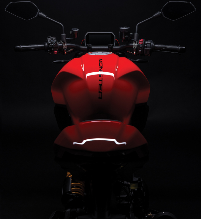 Nowy Monster został zaprojektowany od podstaw, łącząc lekkość i technologię z niepowtarzalną estetyką. Utrzymał styl pierwszego Monstera w nowoczesnym wydaniu. Bardziej opływowy, sportowy i kompaktowy, nowy Monster urzeka, przywracając cechy stylistyczne, które zawsze wyróżniały go spośród innych naked’ów: charakterystyczny reflektor, zbiornik paliwa, jednoczęściowe siedzenie i krótki, lekki tył.