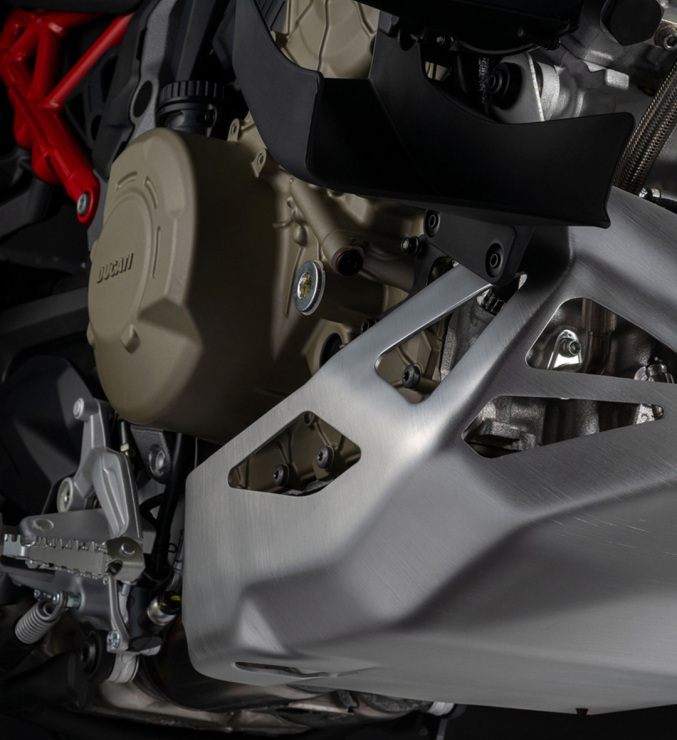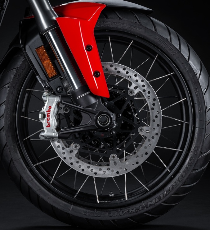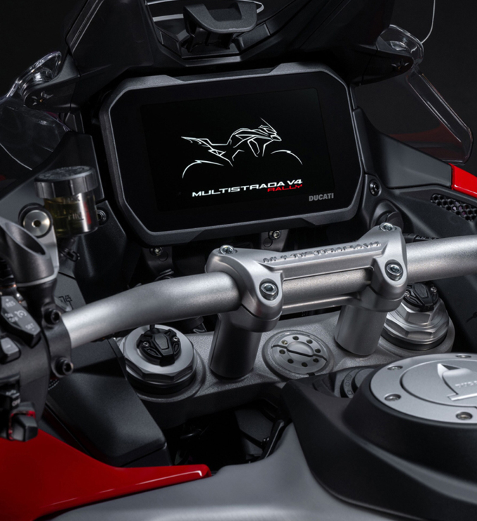 Dodatkowo, aby ułatwić załadunek i rozładunek kufrów bocznych oraz uprościć konserwację układu napędowego, standardem jest podstawka centralna. W wyposażeniu standardowym znajdują się również podgrzewane manetki, które można regulować w pięciu poziomach temperatury. Multistrada V4 Rally jest oferowana wyłącznie z lekkimi, bezdętkowymi kołami szprychowymi, które przyczyniają się do poprawy dynamiki motocykla. Są one standardowo wyposażone w czujnik TPMS, który wyświetla ciśnienie w oponach na ekranie.