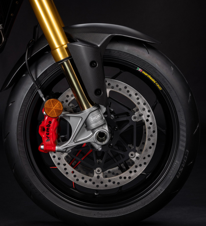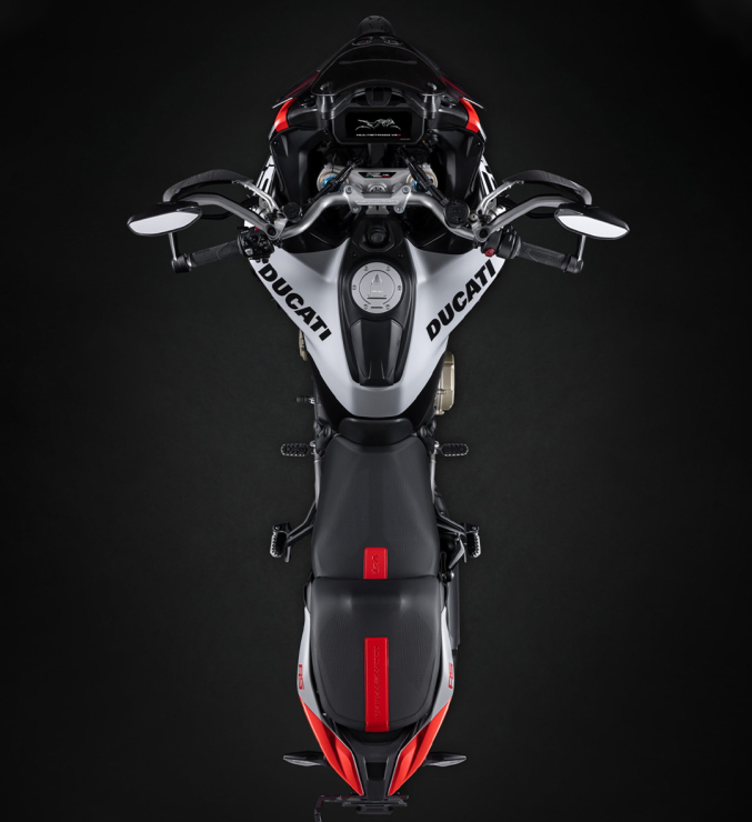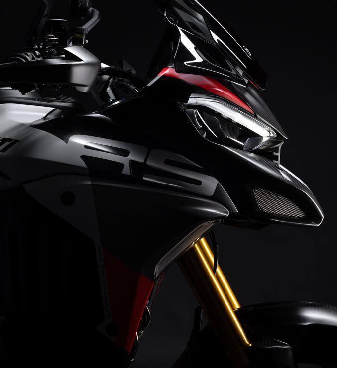 Model łączy niepowtarzalną linię Multistrady, elegancką i dynamiczną, z nowym malowaniem RS. Liczne elementy z włókna węglowego, takie jak przedni błotnik, osłony dłoni, osłony termiczne i przedni dziób, a także kute koła, tłumik Akrapovič, lekki akumulator litowo-jonowy i technopolimerowy ogon zamontowany na tytanowej ramie pomocniczej, przyczyniają się do oszczędności masy o 2 kg w porównaniu z Multistradą V4 Pikes Peak.