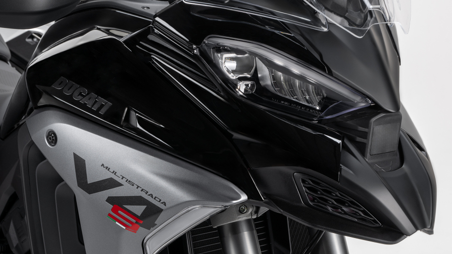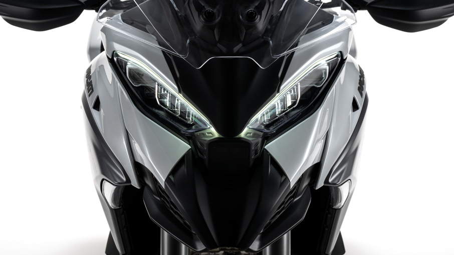 Przeprojektowany przód z bardziej agresywnymi kształtami dosadnie wyraża dynamizm i sportowy charakter przy zachowaniu niezmienionej ochrony kierowcy i pasażera przed pędem powietrza. W szczególności widok z przodu zbliża go do stylu nowego Panigale V4. Podwójny reflektor jest dodatkowo podkreślony przez malowane elementy, dzięki czemu zaznaczone zostało nawiązanie do stylistyki znanej z modeli 916 i 1098. Nowy tłumik ma ostrzejszy kształt i jeszcze bardziej wyrazisty dźwięk, podkreślając tym samym sportowe DNA nowej Multistrady.