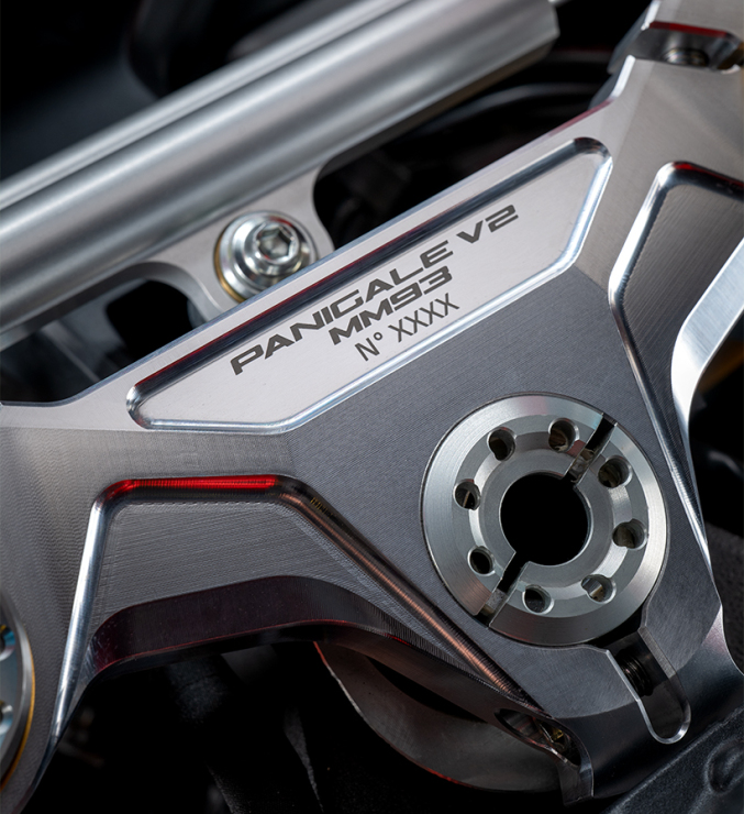 Malowanie Panigale V2 MM93 czerpie inspirację z wyrazistych barw użytych przez Marca podczas posezonowych testów w Barcelonie w 2024 roku. Numerowana wersja wyposażona jest w amortyzator skrętu Öhlins, zapewniający stabilność i precyzję. Taka konfiguracja nie tylko odzwierciedla tożsamość zawodnika, ale także zapewnia optymalną kontrolę podczas intensywnych treningów.