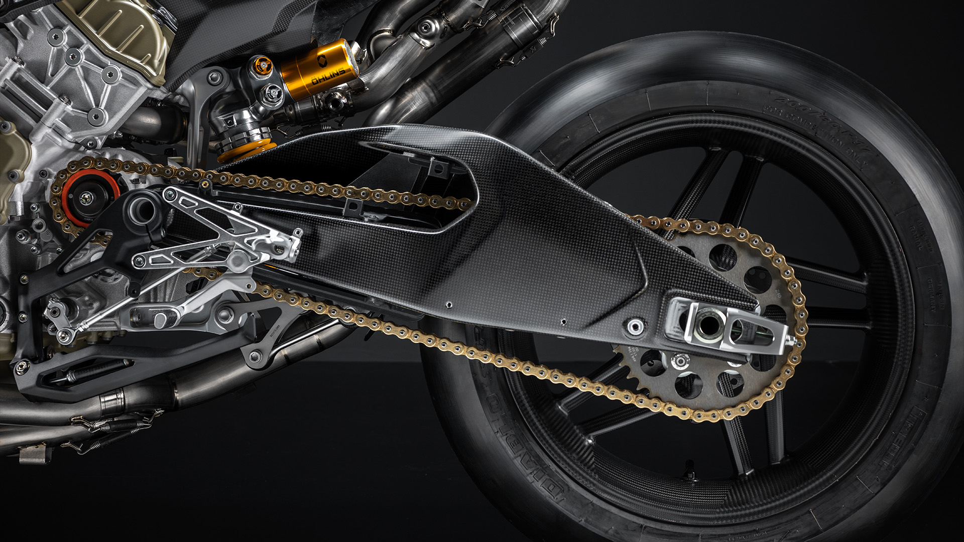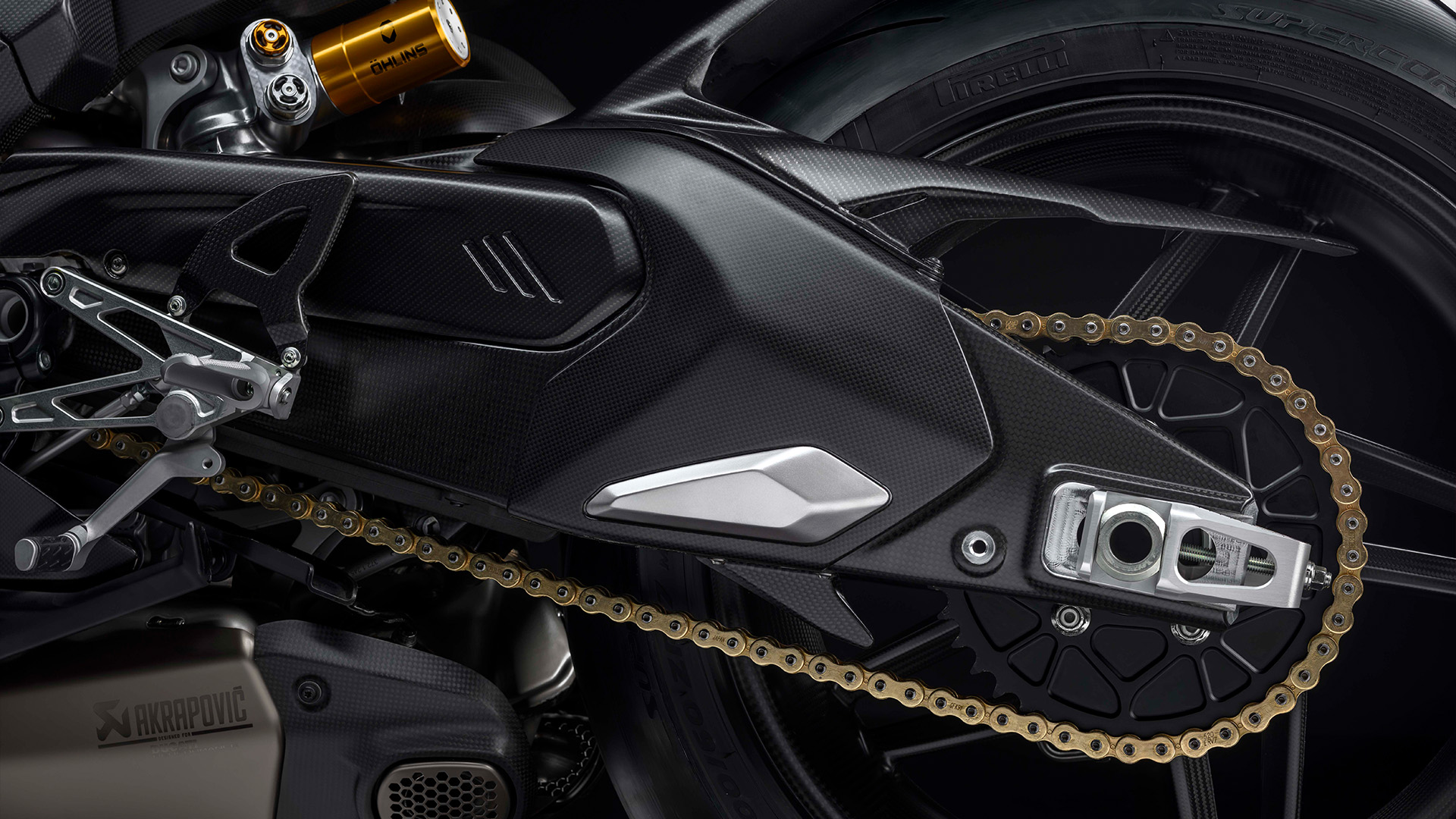 Łańcuch napędowy to DID ERV7, taki sam, jaki stosowany jest w fabrycznych zespołach Superbike. W połączeniu z zębatką wykonaną z Ergalu uzyskano redukcję masy zestawu napędowego o 0,69 kg w porównaniu z Panigale V4 S.