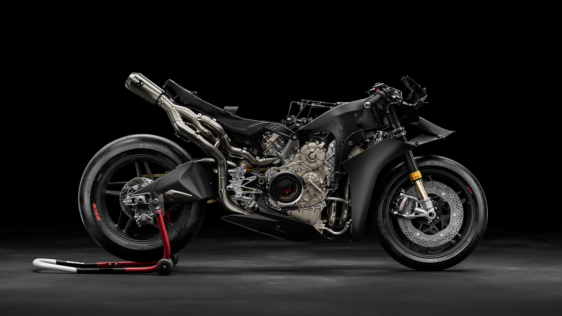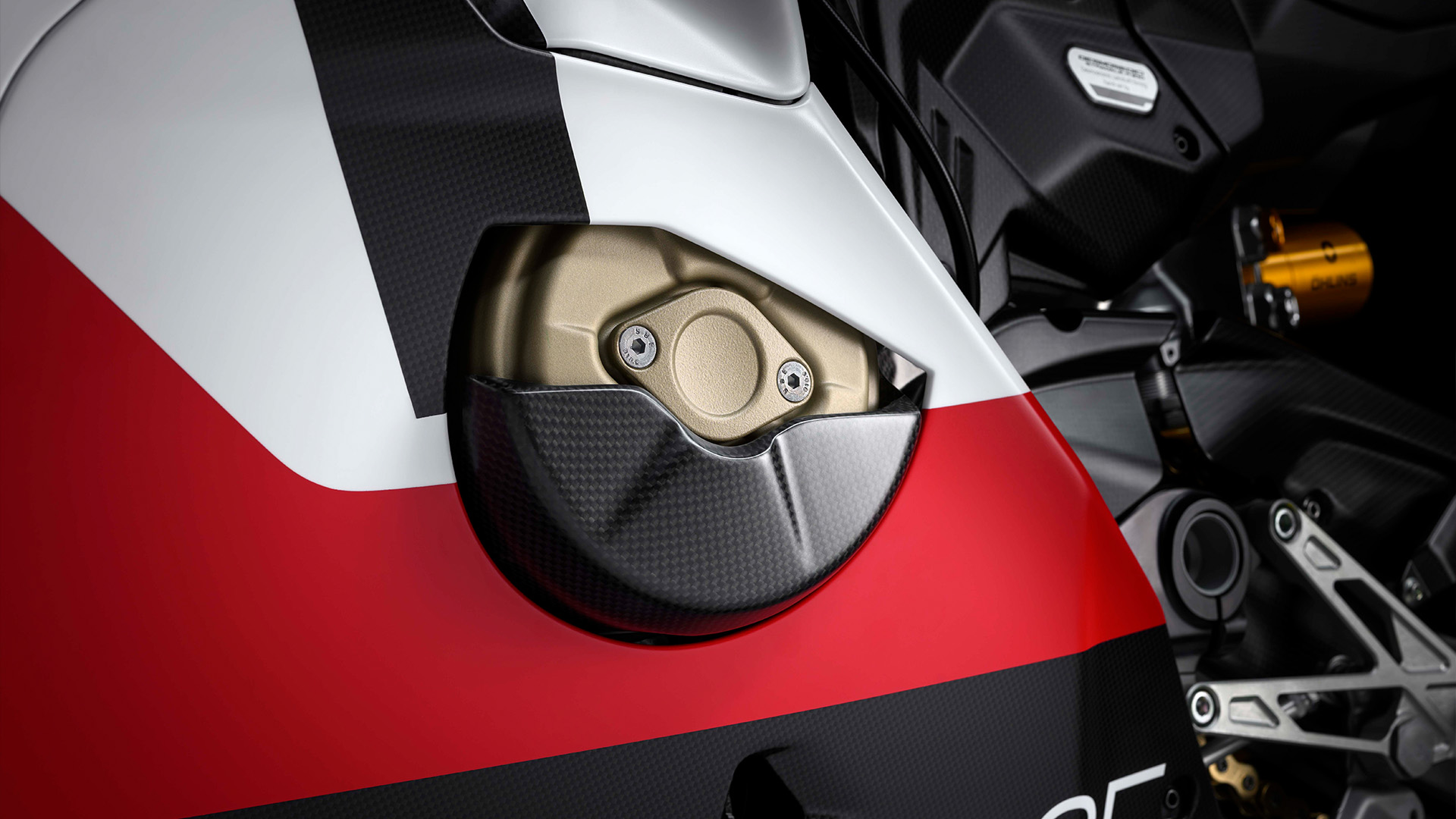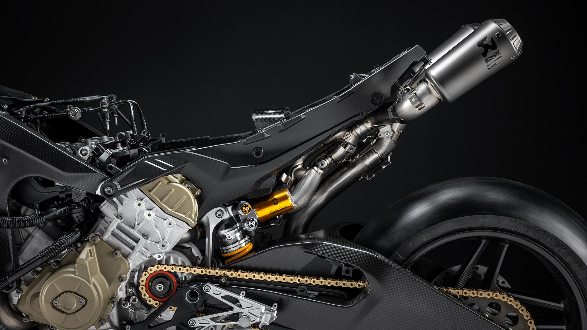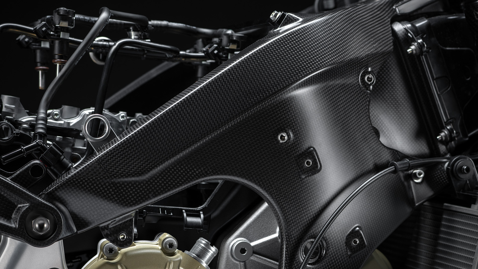 Karbonowa rama główna waży o 17% mniej niż aluminiowa w modelu Panigale V4, oferując kontrolowaną sztywność, która poprawia przyczepność w zakrętach i naturalną tendencję do zamykania linii. Wahacz jest produkowany przy użyciu procesu FDM (Sacrificial Mandrel Process), co pozwala na uzyskanie bardzo lekkiej konstrukcji monolitycznej. W porównaniu z wahaczem aluminiowym jest o 21% lżejszy, przy zachowaniu tych samych wartości sztywności.