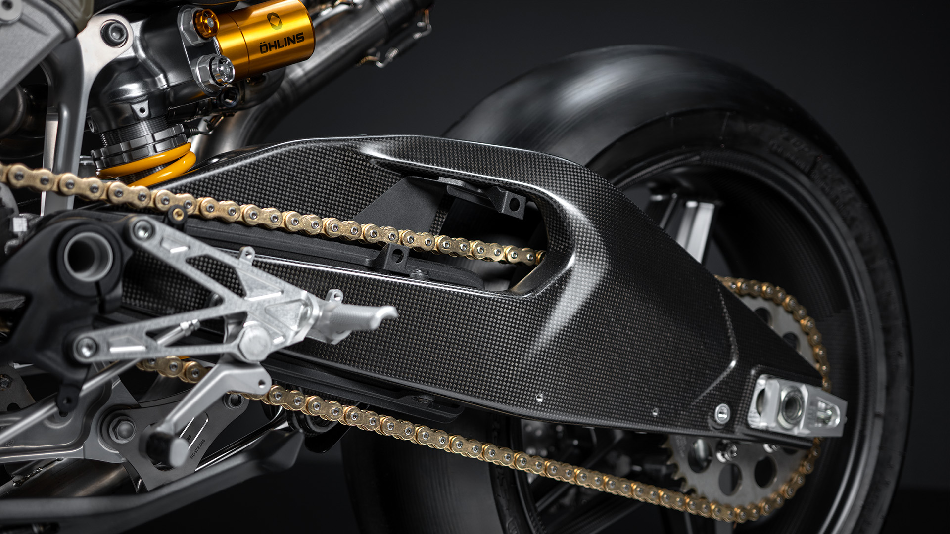 Tylny amortyzator Öhlins TTX36 GP LW wyposażony jest w specjalną, lekką sprężynę oraz wewnętrzne zawory zapożyczone wprost z MotoGP, które poprawiają zdolność do pokonywania drobnych nierówności i umożliwiają łatwą regulację bez użycia narzędzi. Elementy zawieszenia zostały wykonane z tytanu dla zapewnienia maksymalnej lekkości.
