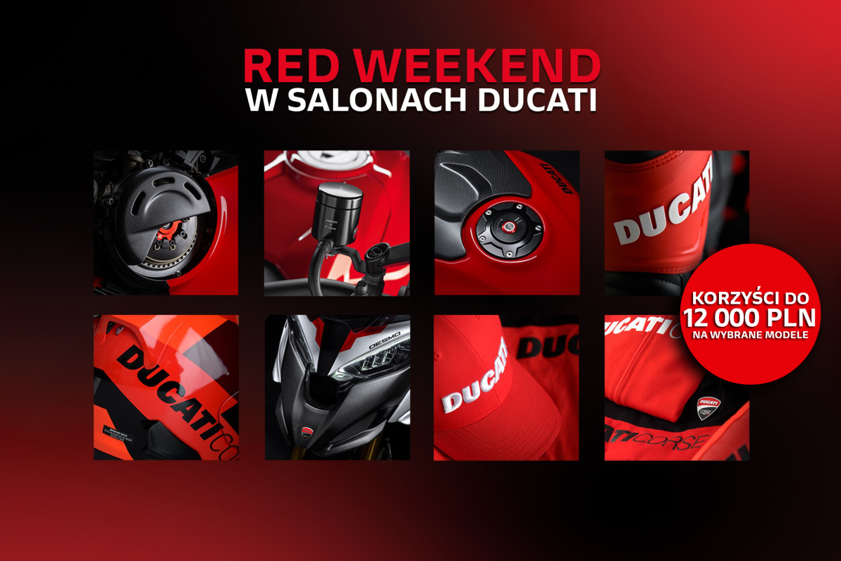 Odwiedź Twojego dealera Ducati i sprawdź specjalną ofertę, która obowiązuje wyłącznie w Red Weekend. Ograniczona czasowo promocja, która nie łączy się z pozostałymi akcjami specjalnymi, obejmuje wybrane modele znajdujące się na stanie magazynowym importera i sieci dealerskiej Ducati w Polsce, które zostaną zamówione w dowolnej autoryzowanej stacji dealerskiej w dniach 28 i 29 listopada 2025 roku. Wpłać zaliczkę na wymarzony motocykl i ciesz się unikatowymi korzyściami, które przygotowaliśmy tylko dla zdecydowanych. Czekałeś na to cały rok!