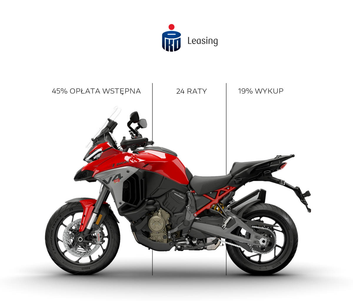 W ramach oferty finansowania przygotowanej we współpracy z PKO Leasing proponujemy leasing operacyjny na korzystnych warunkach oraz pełny pakiet ubezpieczenia zawarty w cenie. Oferta dotyczy wyłącznie nowych motocykli z roku produkcji 2025 Multistrada V2 S, Multistrada V4 S i Multistrada V4 Rally, a także Streetfighter V2 i Streetfighter V2 S, które standardowo objęte są 4-letnią gwarancją fabryczną bez limitu kilometrów. Szczegółowe informacje dostępne są u przedstawicieli dealerów Ducati po przeprowadzeniu symulacji leasingowej. Ramowe parametry oferty obejmują dwa warianty: