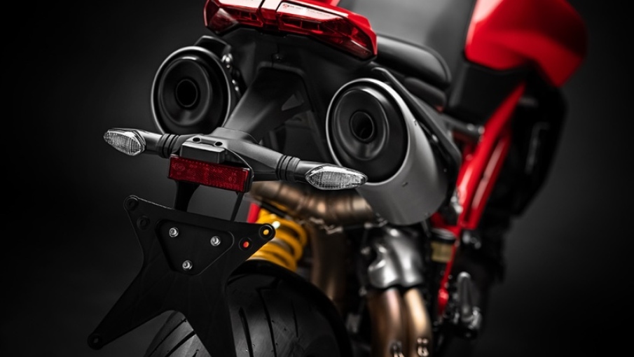 Kanapa ze zwężoną częścią środkową, płynnie przechodząca w 14,5 litrowy zbiornik paliwa, tworzą wizerunek ściśle powiązany ze światem wyścigów motocyklowych. Agresywna forma, złożona z ostrych, czystych linii i gładkich powierzchni staje się jeszcze mocniejsza dzięki podwójnym tłumikom umieszczonym pod kanapą, wąskiej sylwetce i kultowemu już widokowi z przodu, zdominowanemu przez ostry "dziób" z reflektorem w kształcie przypominającym tablicę z numerem startowym. Charakterystyczne światła do jazdy dziennej dają Hypermotardowi nowoczesnego wyglądu.