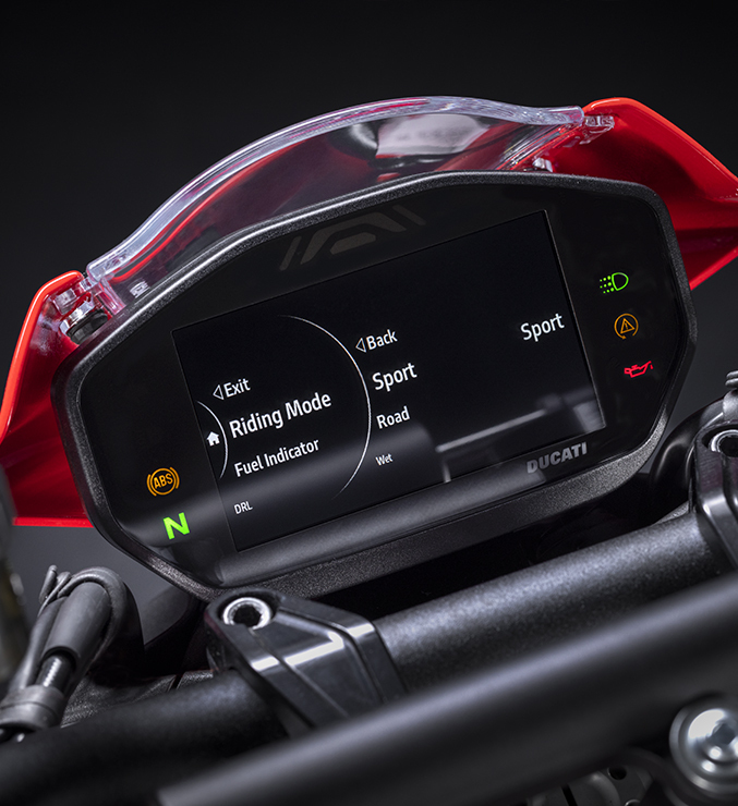 Charakter Monstera SP podkreśla malowanie w kolorach, które występują też na Desmosedici GP zespołu wyścigowego Ducati Lenovo Team, a także tłumik Termignoni oraz złote golenie widelca Öhlins NIX30.