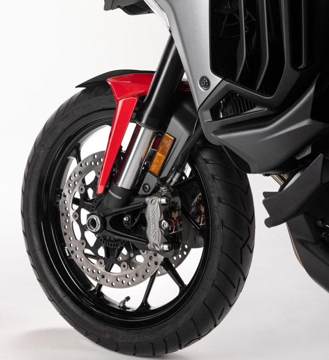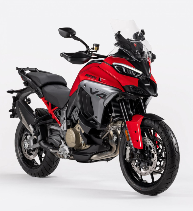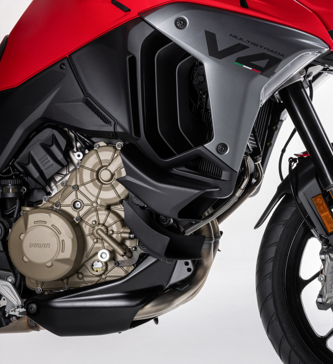 Projekt Multistrady V4 cechuje się niezwykłą funkcjonalnością. Jest solidny i wytrzymały, a jednocześnie wyrafinowany i niezwykle estetyczny. Projektanci Ducati wypracowali doskonałe proporcje i kompaktowość nadwozia w rozstawie osi – idealne połączenie formy i funkcji. Da się to zauważyć w muskularnych gabarytach przedniej części nadwozia z 22-litrowym zbiornikiem paliwa, który umożliwia optymalną pozycję nawet podczas jazdy na stojąco na odcinkach terenowych.