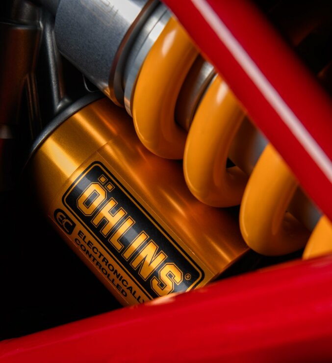 Aby jeszcze mocniej podkreślić swoje sportowe nastawienie, nowa Multistrada V4 Pikes Peak wyposażona jest w wiele komponentów wykonanych z włókna węglowego, a także tłumik Akrapovič wykonany z połączenia tytanu i karbonu (dopuszczony do ruchu drogowego). Inne wyróżniające elementy to niska, przyciemniana szyba z pleksi, anodowany na złoto przedni widelec Öhlins, dwukolorowe czarno-czerwone siedzenie ozdobione logo V4 oraz emblemat Ducati Corse umieszczony na „dziobie”.