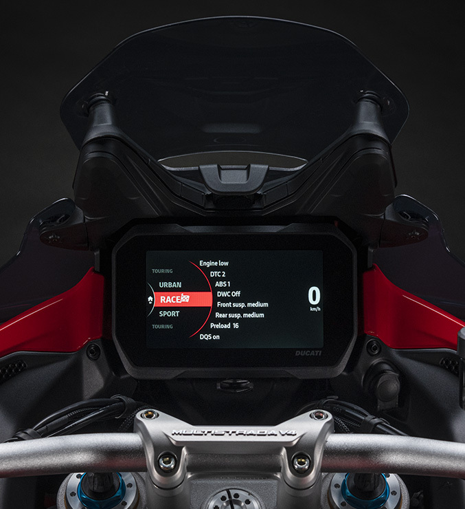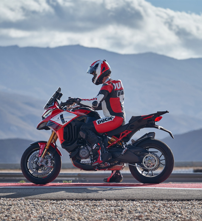 Multistrada V4 Pikes Peak wyróżnia się ergonomią, zaprojektowaną specjalnie w celu zapewnienia maksymalnej kontroli. Pozycja motocyklisty została całkowicie przeprojektowana w stosunku do Multistrady V4. Podnóżki znajdują się wyżej i są przesunięte do tyłu, zwiększając maksymalny kąt pochylenia, podczas gdy kierownica jest niższa, węższa i mocniej zakrzywiona. Efektem jest lepsze wyczucie podczas sportowej jazdy przy zachowaniu doskonałego poziomu komfortu.