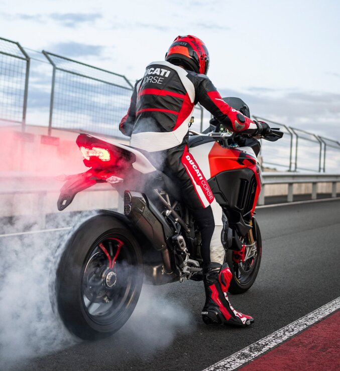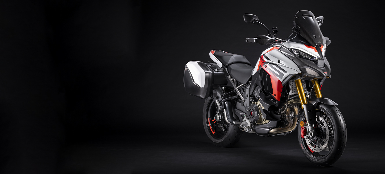 Multistrada V4 RS to model, w którym każdy element i szczegół został stworzony w celu produkcji najbardziej sportowego motocykla turystycznego w historii. Wersja V4 RS łączy w sobie niepowtarzalną linię Multistrady, czyli niezwykle elegancką, dynamiczną i turystyczną z rozwiązaniami technicznymi oraz technologiami, które są stosowane w motocyklach wyścigowych i supersportowych z Borgo Panigale. Nazwa RS przypomina inny motocykl Ducati – Monstera S4 RS, który powstał zgodnie z tym samym zamysłem oraz recepturą. Różne elementy z włókna węglowego, takie jak przedni błotnik, osłony dłoni zaprojektowane specjalnie dla tego modelu, osłony termiczne czy przedni „dziób” tworzą grę kontrastów z lakierem Iceberg White, wzbogaconą o różne odniesienia do koloru motocykla Desmosedici, który startował w serii MotoGP. Smukły i lekki ogon integruje w sobie uchwyty pasażera i tworzy tym samym sportowy, wyrafinowany oraz niepowtarzalny widok z boku. Tytanowa tylna rama pomocnicza jest elementem o dużej elegancji technicznej, która nie tylko podkreśla sportowy charakter V4 RS, ale pozwala także na zmniejszenie masy o 2,5 kg względem standardowej wersji.