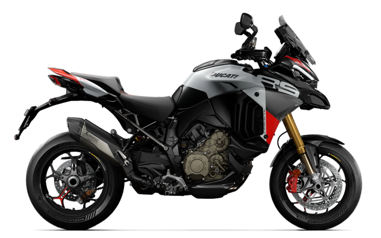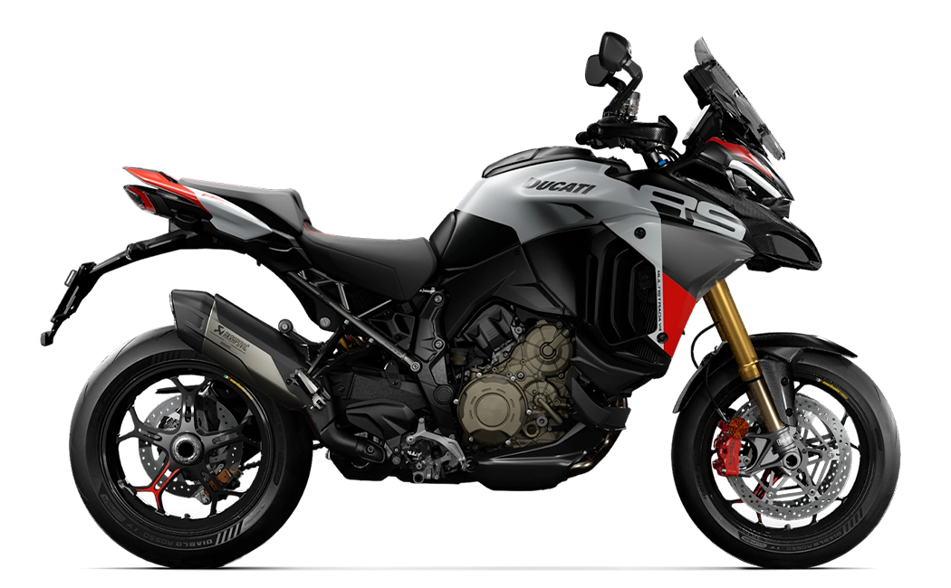 Multistrada V4 RS to model, w którym każdy element i szczegół został stworzony w celu produkcji najbardziej sportowego motocykla turystycznego w historii. Wersja V4 RS łączy w sobie niepowtarzalną linię Multistrady, czyli niezwykle elegancką, dynamiczną i turystyczną z rozwiązaniami technicznymi oraz technologiami, które są stosowane w motocyklach wyścigowych i supersportowych z Borgo Panigale. Nazwa RS przypomina inny motocykl Ducati – Monstera S4 RS, który powstał zgodnie z tym samym zamysłem oraz recepturą. Różne elementy z włókna węglowego, takie jak przedni błotnik, osłony dłoni zaprojektowane specjalnie dla tego modelu, osłony termiczne czy przedni „dziób” tworzą grę kontrastów z lakierem Iceberg White, wzbogaconą o różne odniesienia do koloru motocykla Desmosedici, który startował w serii MotoGP. Smukły i lekki ogon integruje w sobie uchwyty pasażera i tworzy tym samym sportowy, wyrafinowany oraz niepowtarzalny widok z boku. Tytanowa tylna rama pomocnicza jest elementem o dużej elegancji technicznej, która nie tylko podkreśla sportowy charakter V4 RS, ale pozwala także na zmniejszenie masy o 2,5 kg względem standardowej wersji.