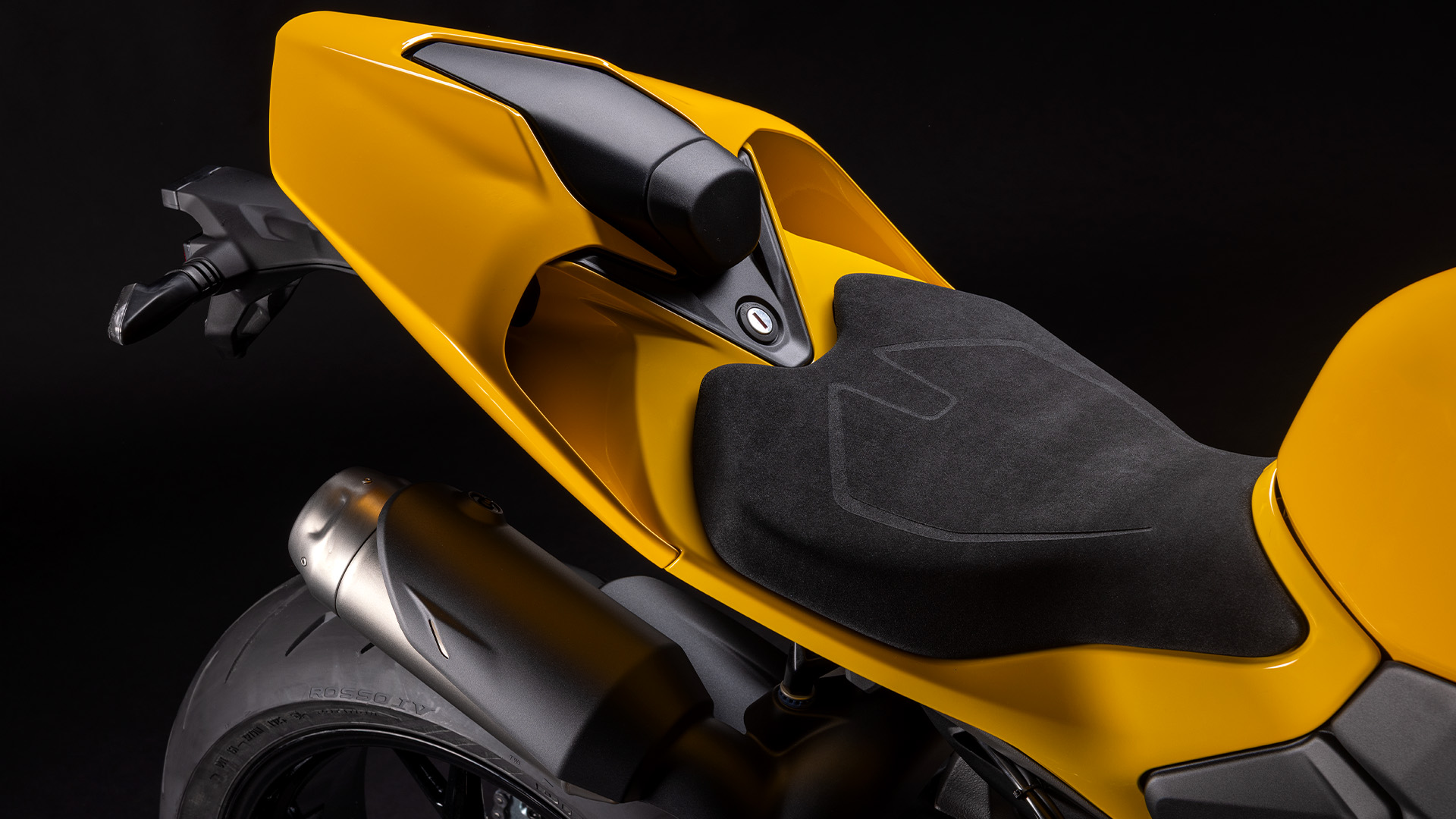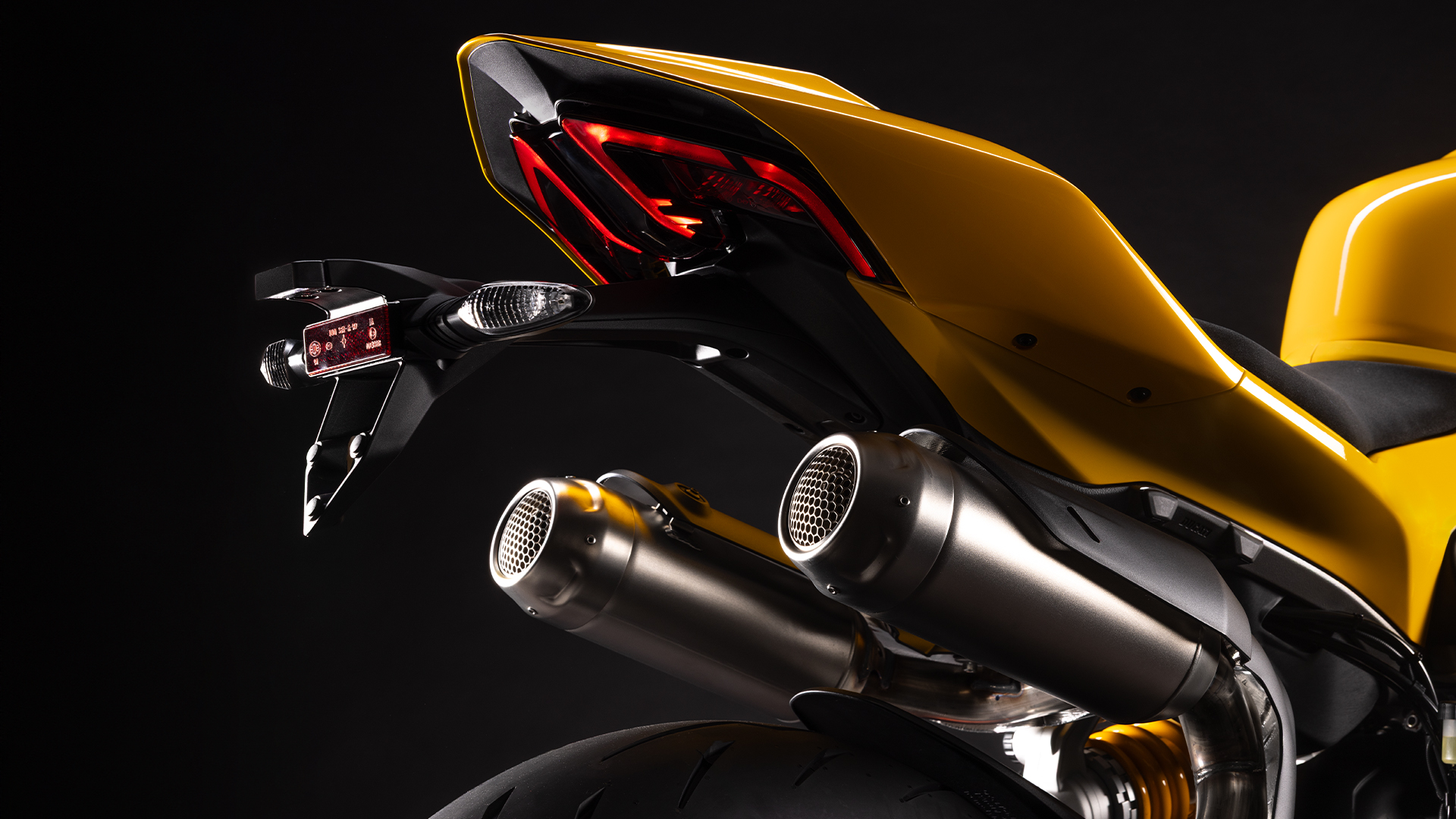 Przód motocykla to wyraźne nawiązanie do nowego Panigale V4. Reflektor Full-LED posiada światła DRL, które nadają mu ten sam agresywny wygląd. Konstrukcja zbiornika paliwa została przeanalizowana pod względem rozmiaru i przede wszystkim samego kształtu po to, aby pomagać kierowcy w sportowej jeździe. W tym elemencie również widać inspirację Panigale V4, jednak bak został dostosowany do nowego silnika, a także zoptymalizowany ergonomicznie w celu zmniejszenia obciążenia nadgarstków przy jednoczesnym zachowaniu doskonałego wyczucia przodu podczas pokonywania zakrętów. Tył również otrzymał stylizację inspirowaną Panigale V4 i płynnie łączy się ze zbiornikiem, tworząc monolityczny efekt wyraźnie inspirowany modelem 916. W pełni diodowe tylne światło jest podzielone na dwie części. Wydech, który kończy się dwoma tłumikami umieszczonymi pod siedzeniem, nawiązuje do wyścigowej tradycji Panigale i podkreśla sportową duszę motocykla. Konstrukcja nowych szprychowych kół jest nowoczesną reinterpretacją kultowego wyglądu trójramiennych kół Marchesini. Czarny kolor tworzy kontrastujący efekt z czerwienią Ducati.
