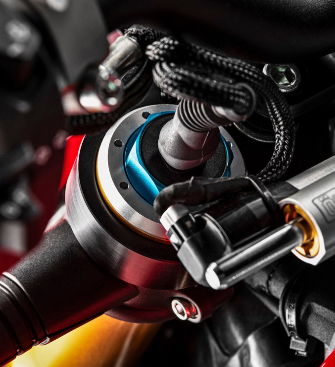 Elementami rozpoznawczymi modelu Streetfighter V4 są dwupłatowe spojlery po obu stronach. Stworzone zostały przez specjalistów wyścigowych z użyciem technologii CFD. Poza wyjątkową estetyką, zapewniają 28 kg siły docisku przy 270 km/h. Dzięki nim przednie koło unosi się mniej ochoczo, a Streetfighter V4 ma większą stabilność przy hamowaniu i w momencie inicjowania zakrętu. W tym motocyklu niepowtarzalny styl, dopracowana aerodynamika oraz zaawansowana elektronika płynnie się uzupełniają.